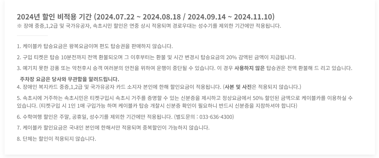 케이블카는 왕복으로 운영되며, 대인은 15,000원, 소인은 11,000원, 유아는 무료입니다. 강풍 예고가 있으면 운행이 중단될 수 있으니 꼭 확인하세요. 제 친구는 11시쯤 갔다가 매진되어 한 시간 넘게 기다렸습니다. 이왕 가시는 거면 일찍 서둘러서 가시길 권장합니다.